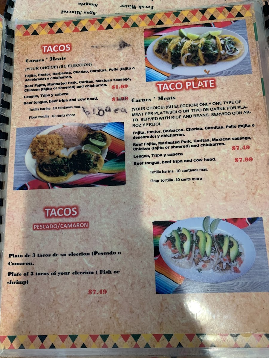 3 Tacos of your choice. Served with beans and rice, corn tortilla.