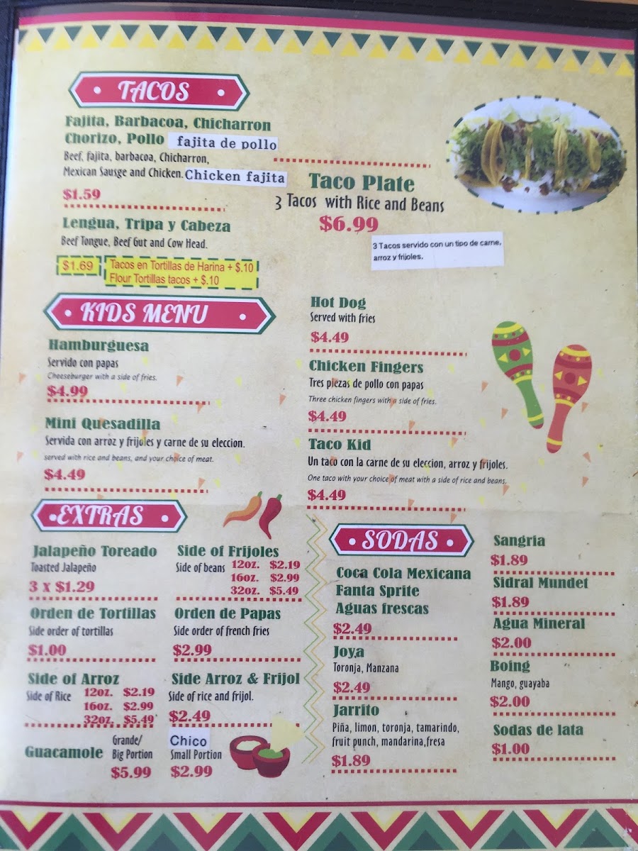 Servidos con frijoles y arroz, tortilla de maiz o harina / "served with beans and rice, corn tortilla or flour.